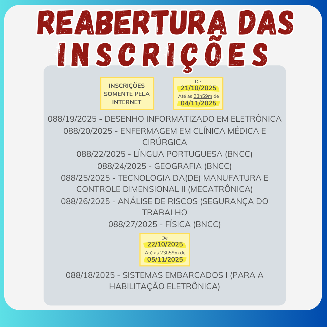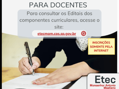 O Superintendente da ESCOLA TÉCNICA ESTADUAL MONSENHOR ANTÔNIO MAGLIANO, da cidade de GARÇA, à vista das disposições dos §§ 1º e 4º do artigo 3º da Deliberação CEETEPS 41, de 9, publicada no DOE 16/08/2018 (e suas alterações), TORNA PÚBLICA A REABERTURA de inscrições aos Processos Seletivos Simplificados para formação de cadastro reserva, para a função de Professor de Ensino Médio e Técnico, objetivando a admissão temporária para atender a necessidade de excepcional interesse público, sob o regime da Consolidação das Leis do Trabalho – CLT e legislação trabalhista complementar, nos componentes curriculares a seguir discriminados: