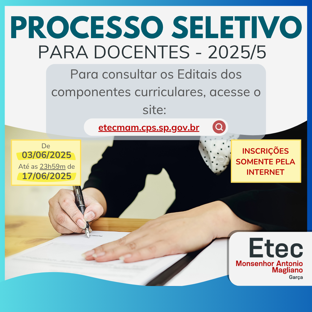 O Diretor da ESCOLA TÉCNICA ESTADUAL MONSENHOR ANTÔNIO MAGLIANO, nos termos da Deliberação Ceeteps nº 41, de 9 de agosto de 2018, alterada pelas Deliberações Ceeteps nº 68, de 7 de janeiro de 2021, nº 79, de 13 de janeiro de 2022, e nº 99, de 4 de dezembro de 2023, torna pública a abertura de inscrições e a realização de Processo Seletivo Simplificado, objetivando a formação de cadastro reserva de docentes, para a contratação por prazo determinado na função de Professor de Ensino Médio e Técnico, para atender a necessidade temporária de excepcional interesse público, mediante as condições estabelecidas nas Instruções Especiais, contidas nos presentes editais: